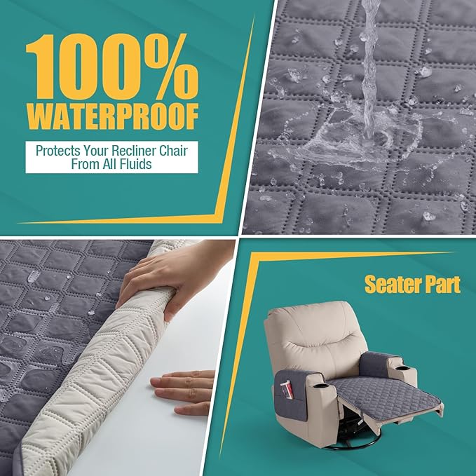 - 100% WATERPROOF: The waterproof recliner chair covers is made of a unique fabric and treated with a waterproof coating on top to prevent spills, accidents and leaks, making your recliner new and clean. Perfect for homes with pets and children