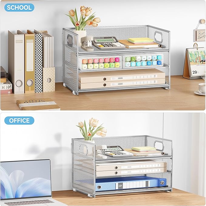 - Paper Organizer Function and Usage: The mesh desktop file organizer can hold various items including paper, folders, books, bills, notebooks, etc. The open design enables quick identification and access to contents, helping to declutter and organize the desk