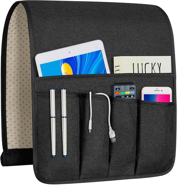 - 【SIZE AND POCKETS】The 35 x 12.4 inch couch caddy, fit most sofas, recliners and chair armrests, avoid the armrests from being worn or damaged, the organizer has 5 pockets, You keep newspapers, magazines, iPads in the largest pocket, and portable devices like remotes, glasses, cell phones, etc. in four standard pockets for easy access.