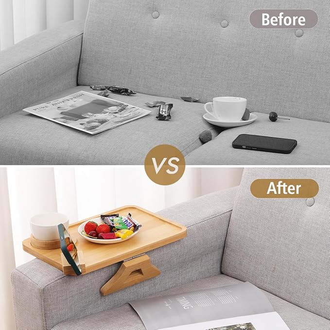 - ๐ก๐ผ๐ป-๐๐น๐ถ๐ฝ ๐๐ฒ๐๐ถ๐ด๐ป: The wooden clips on both sides and the non-slip design on the bottom of the sofa arm tray keep it firmly on the armrests of the sofa. Say goodbye to slipping accidents and protect your sofa from stains caused by food and drinks. Our Kssiaz couch arm tray offers both functionality and sofa protection.
