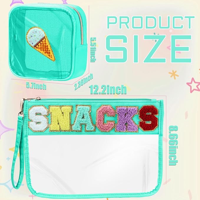 - 【Stylish Design】 The clear makeup bag features a vibrant 'Snacks' text patch with colorful chenille letters, adding a fun and playful touch