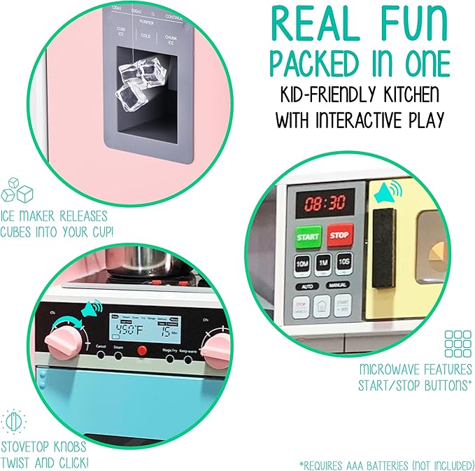 - SUPER REALISTIC SIGHTS & SOUNDS | Much More Than a Toy, Our Interactive Design Enables Meaningful STEM Learning as Boys & Girls Immerse Themselves in a Real Kitchen Setup | Elements Include Pretended Ice Dispenser, Microwave with Light & Sounds, Stove Top with Realistic Sound and light, Battery Operated Range hood, Lighting oven, Clicking Knobs, Twisting Dials, Labels & More