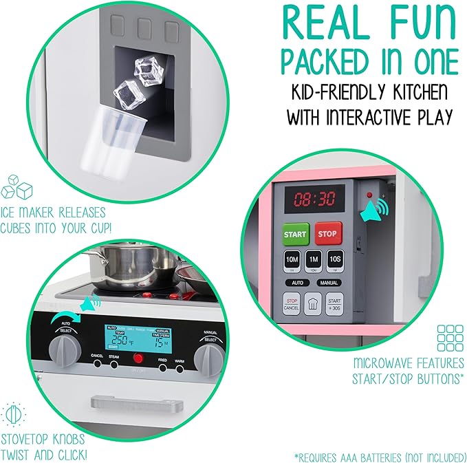 - SUPER REALISTIC SIGHTS & SOUNDS | Much More Than a Toy, Our Interactive Design Enables Meaningful STEM Kinesthetic Learning as Boys & Girls Immerse Themselves in a Real Kitchen Setup | Elements Include Battery-Operated Microwave, Oven, & Range w/ Light & Sound, Clicking Knobs, Ice Dispenser That Throughs Out Ice Cubes & Much More