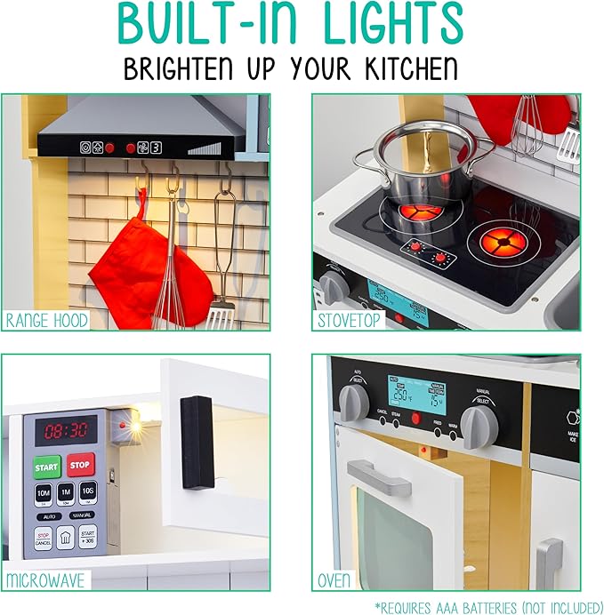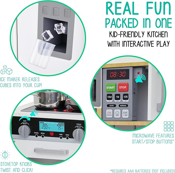 - SUPER REALISTIC SIGHTS & SOUNDS | Much More Than a Toy, Our Interactive Design Enables Meaningful STEM Kinesthetic Learning as Boys & Girls Immerse Themselves in a Real Kitchen Setup | Elements Include Battery-Operated Microwave, Oven, & Range w/ Light & Sound, Clicking Knobs, Ice Dispenser That Throughs Out Ice Cubes & Much More