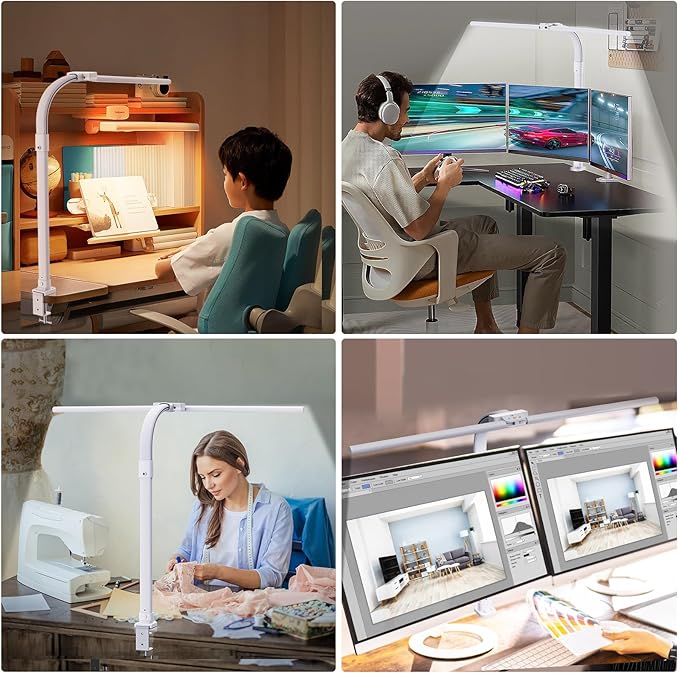 - [Adjustable Gooseneck and Space Saving] The flexible and durable silicone gooseneck of the office desk lamp allows you to adjust the height and multiple angles of the light. The sturdy clamp with silicone pads protects and supports the desktop with a thickness of 5.9 cm, the desk lamp can be clamped on the desktop and takes up little space on the desktop.