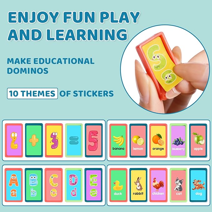 - 200pcs Domino Train with Stickers: BAIWER domino train toy set includes 1 train toy with lights and music, 200 pcs dominoes with 3 colors, 200 pcs stickers of 10 themes, 2 card slots, and 1 cactus spinner. 2 slots are designed for children to continue to play without waiting. A number of 200pcs dominoes and 200pcs funny educational stickers for kids will bring them more creative games