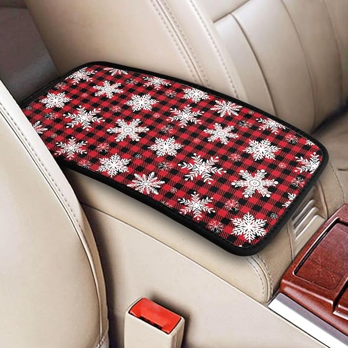 DORKEIXIA Snowflake Christmas Red Buffalo Plaid Auto Center Console Armrest Pad Universal Car Center Console Cover Seat Box Cover for Sedan, Van, SUV, Truck Car Accessorie