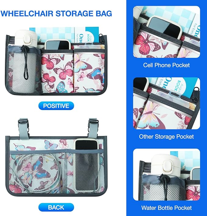Wheelchair Bag, Walker Bag, Wheelchair Side Bag, Armrest Organizer Pouch with Cup Holder Attachment and Reflective Strip, Accessories for Most Wheelchairs, Walker, Rollators, Butterfly