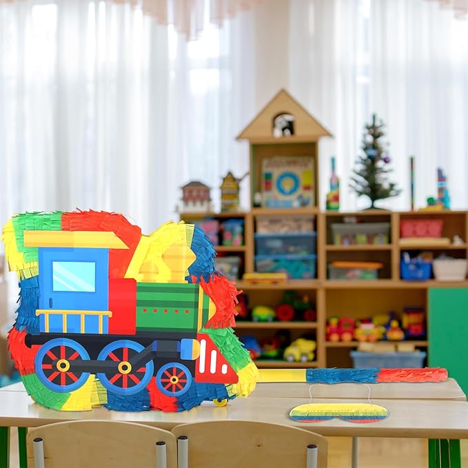 - ⭐ Top-Notch Materials - Sized at 15.8 x 11.8 x 2 inches, this train head pinata is crafted with durable, high-quality cardboard and accented with vibrant crepe paper for a festive appearance. The strong plastic loop allows for easy, secure hanging. Comes complete with a bat and blindfold for extra fun!