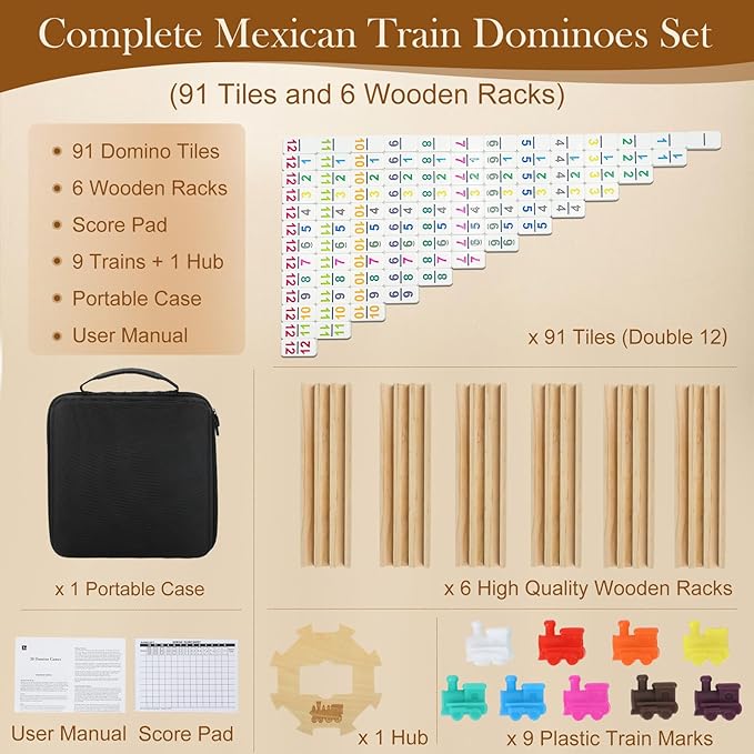 - INCLUDES 6 WOODEN RACKS TO KEEP TILES ORGANIZED: Soopotay mexican train dominoes set comes with 6 wooden tile holders, which help to keep tiles organized and stable, enabling players to concentrate on strategic gameplay without interruptions