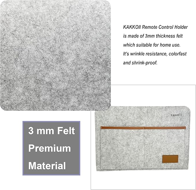 - Soft Material- KAKKOII remote control holder is made of 3mm thickness felt which suitable for home use. It's wrinkle resistance, colorfast and shrink-proof, sturdy and soft, ensuring it won't scratch or damage your belongings. It's designed with care to protect your possessions.