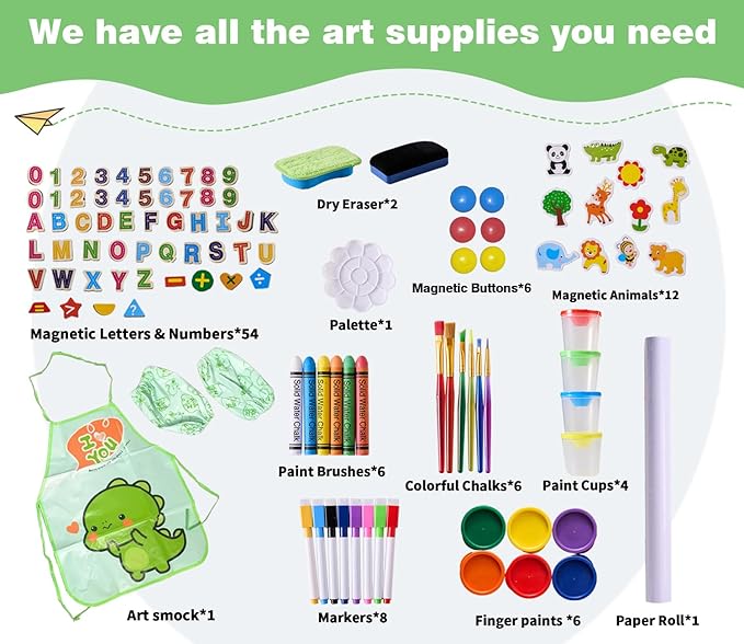 • 【Luxurious art accessories】You will get 2 paper rolls, 6 finger paints, 4 markers, 4 paint pots, 6 round magnetic buttons, 1 set of magnetic letters and numbers, 1 dry eraser, 5 paint brushes, 1 palette board, 1 art smock and 12 colored chalks. Art has no age limit. Embark on an artistic journey with your children.