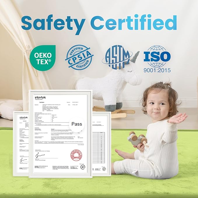 - Premium Safety Certified: Our baby play mat meets the highest safety standards, featuring OEKO-TEX certified fabric and CERPITUR-US certified elasti-foam,ensuring no harmful chemicals. It also passes ASTM & CPSIA tests, making it safe for infants & toddlers.
