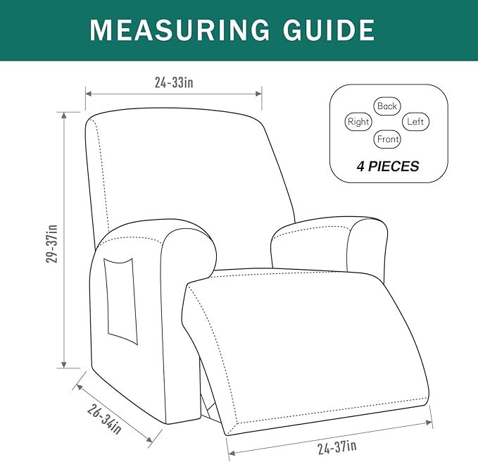 - PERFECT FIT: NILUOH recliner chair covers are elastic enough to fit for most standard large recliner chair. Perfectly fit recliner chair with seat widths between 24-33 inches. The practical size is shown in the picture, please refer to the measurement picture before purchase. Pocket on side for storing remote controls or magazines, the recliner cover is suitable for different scenarios, such as reading, watching TV, resting.