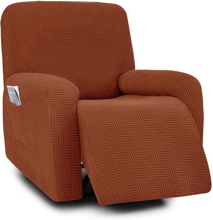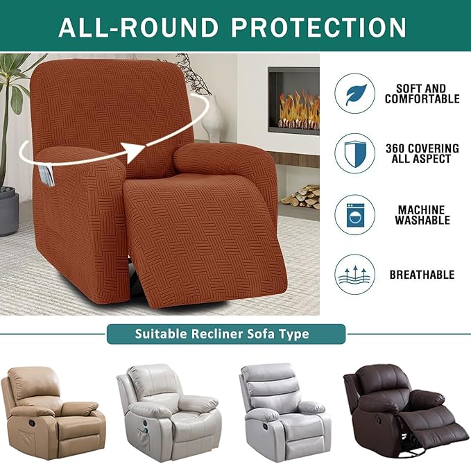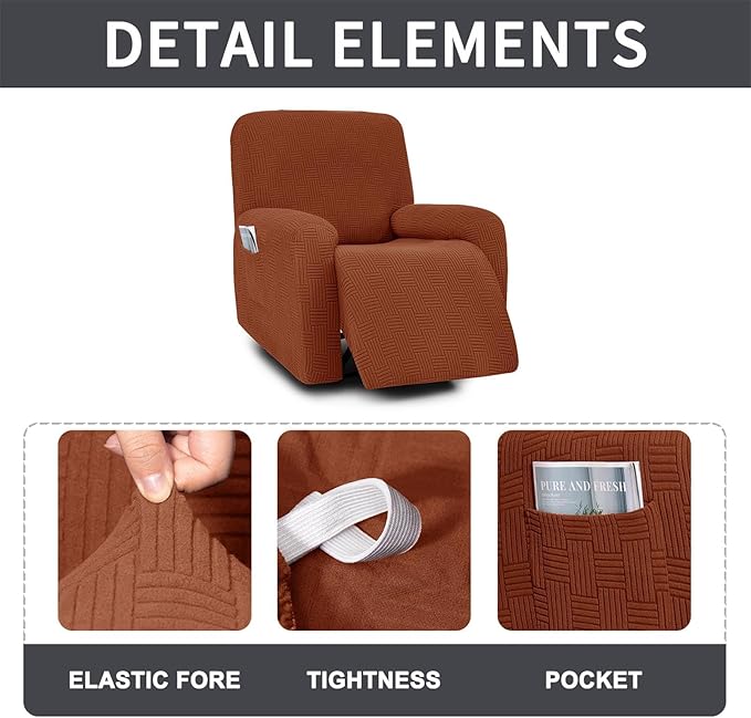 NILUOH Recliner Cover 4 Pieces Stretch Jacquard Recliner Chair Cover with Side Pocket Anti-Slip Fitted Washable Reclining Chair Protector with Elastic Bottom for Kids, Pets, Dogs