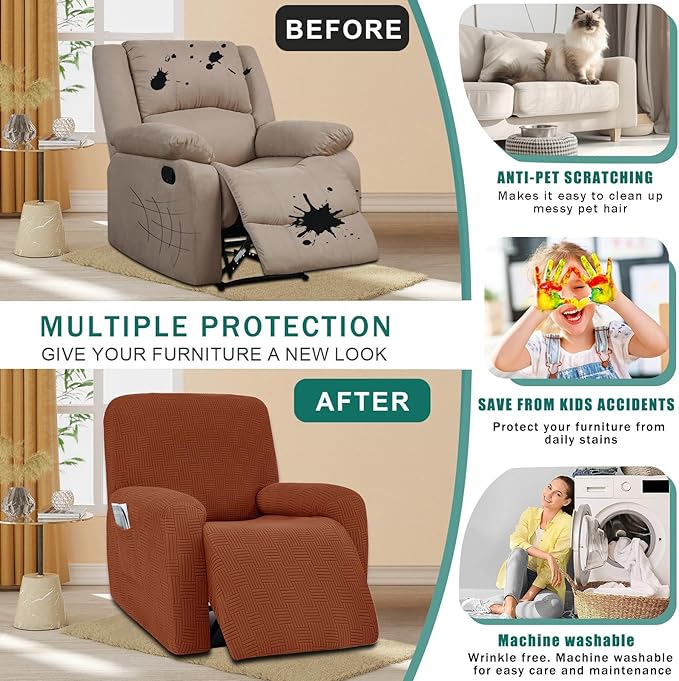 - KID AND PET FRIENDLY: NILUOH Recliner Covers have thick elastic on the bottom and anti-slip buckles to keep them in place, providing an extra layer of protection for your furniture. Protect your reclining chair from spills, stains and tears. Moreover, it is highly durable, guarding against potential damage from your pets' scratching, while also acting as a barrier against pet hair. Great choice for families with children and pets. Update your decor with recliner covers.