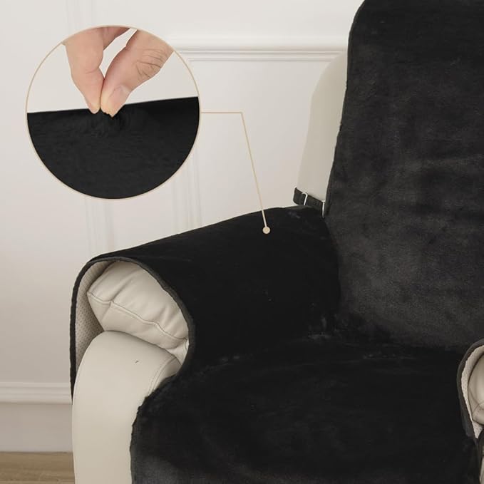 RBSC Home Waterproof Faux Fur Recliner Covers - Black Antislip Recliner Chair Slipcover Faux Rabbit Plush Furniture Protector with Elastic Straps for Kids, Dogs, Pets