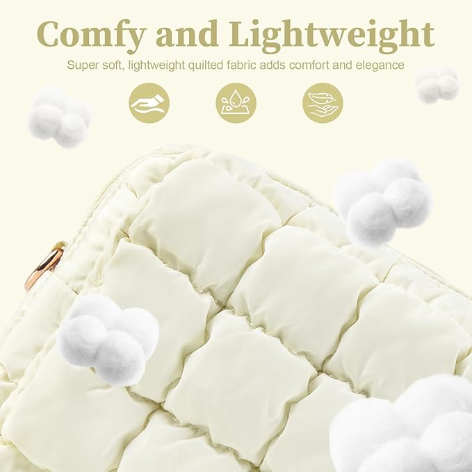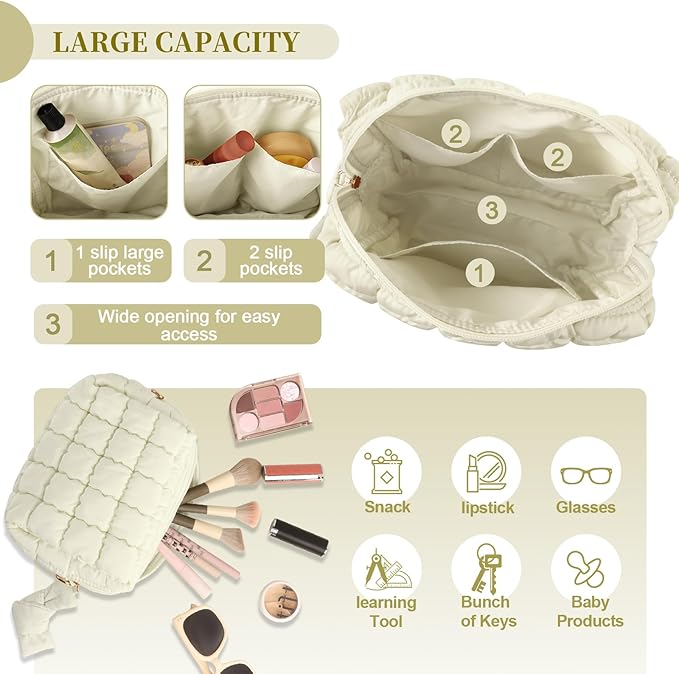 - 【Soft & Lightweight Material】:The quilted makeup bag is made of high-quality cotton fabric with a fluffy padded structure that ensures comfort to the touch without causing any friction or discomfort to the skin. Chic quilting patterns, combined with superb craftsmanship, ensure that your accessories remain safe on the inside.