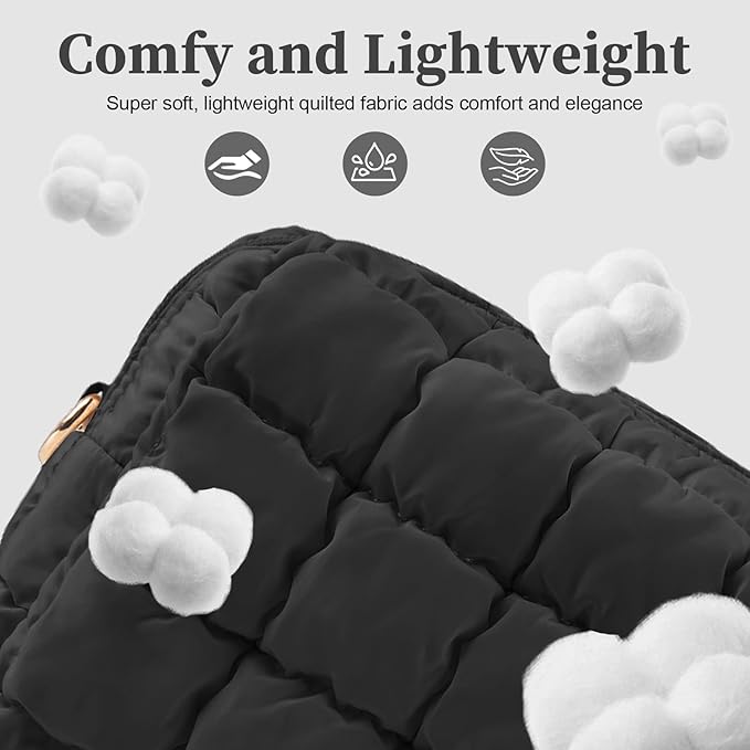 - 【Soft & Lightweight Material】:The quilted makeup bag is made of high-quality cotton fabric with a fluffy padded structure that ensures comfort to the touch without causing any friction or discomfort to the skin. Chic quilting patterns, combined with superb craftsmanship, ensure that your accessories remain safe on the inside.