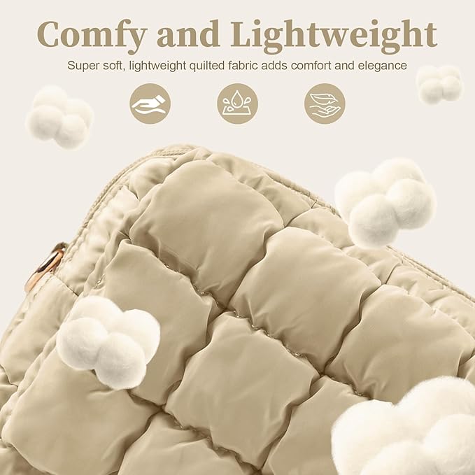 - 【Soft & Lightweight Material】:The quilted makeup bag is made of high-quality cotton fabric with a fluffy padded structure that ensures comfort to the touch without causing any friction or discomfort to the skin. Chic quilting patterns, combined with superb craftsmanship, ensure that your accessories remain safe on the inside.