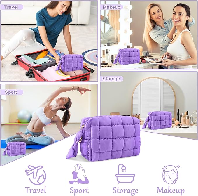 Puffer Quilted Makeup Bag Cosmetic Bags,Puffy Travel Toiletry Pouch for Women,Cute Checkered Zipper Bag Travel Essential,Portable Aesthetic Make up Organizer Bag for Gifts Work Daily(Purple,S)