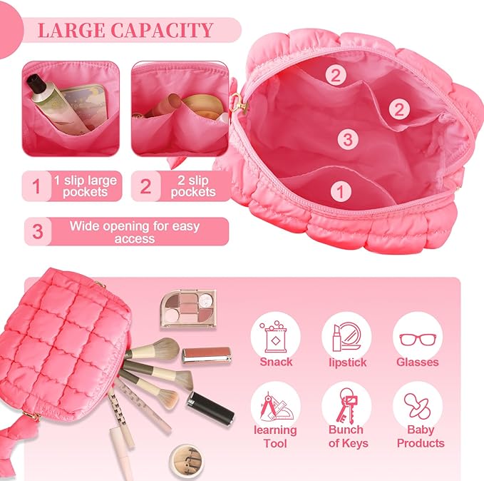 - 【Soft & Lightweight Material】:The quilted makeup bag is made of high-quality cotton fabric with a fluffy padded structure that ensures comfort to the touch without causing any friction or discomfort to the skin. Chic quilting patterns, combined with superb craftsmanship, ensure that your accessories remain safe on the inside.