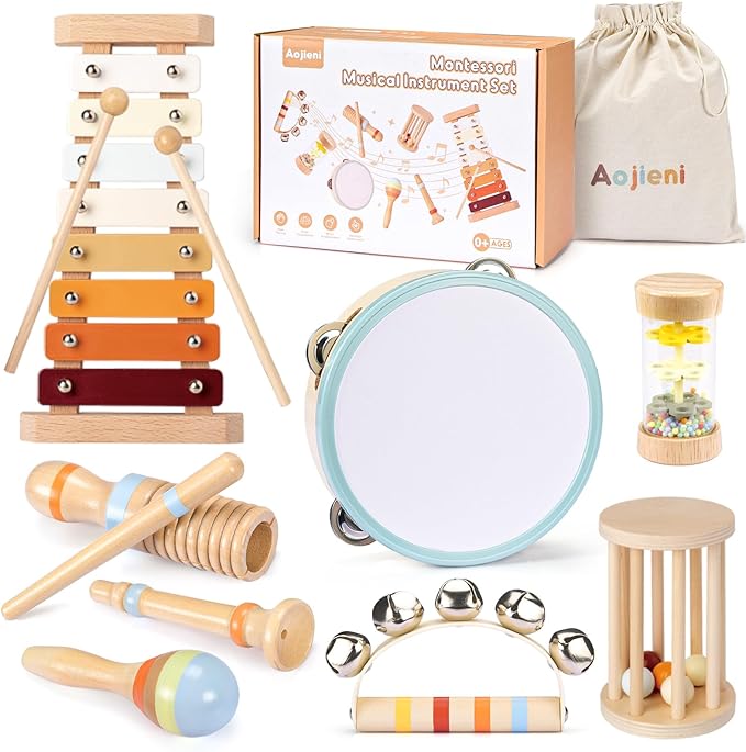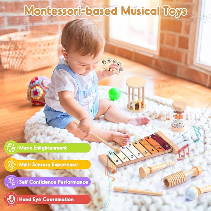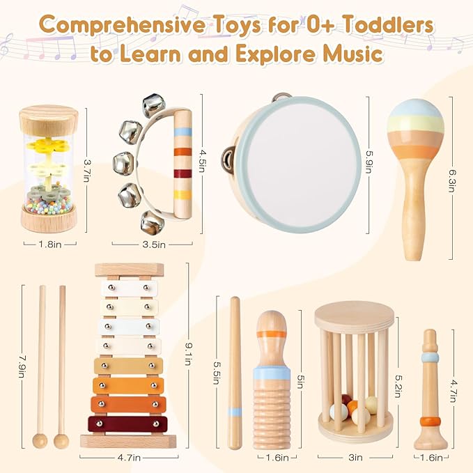 - Various Musical Toys for Toddlers: 8 in 1 Musical set includes xylophone, tambourine, maraca, trumpet, wooden sounder, hand bell, rainmaker, rain sound tube. Each instrument has vivid colors and different sounds to attract children's attention, spark their curiosity, and enrich their auditory experiences, which is comprehensive music enlightenment for babies musical learners.
