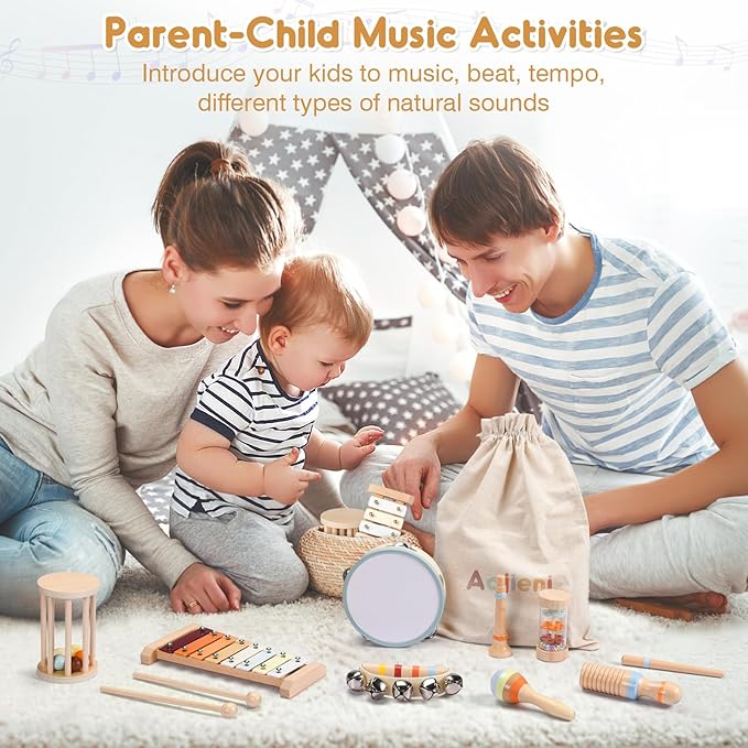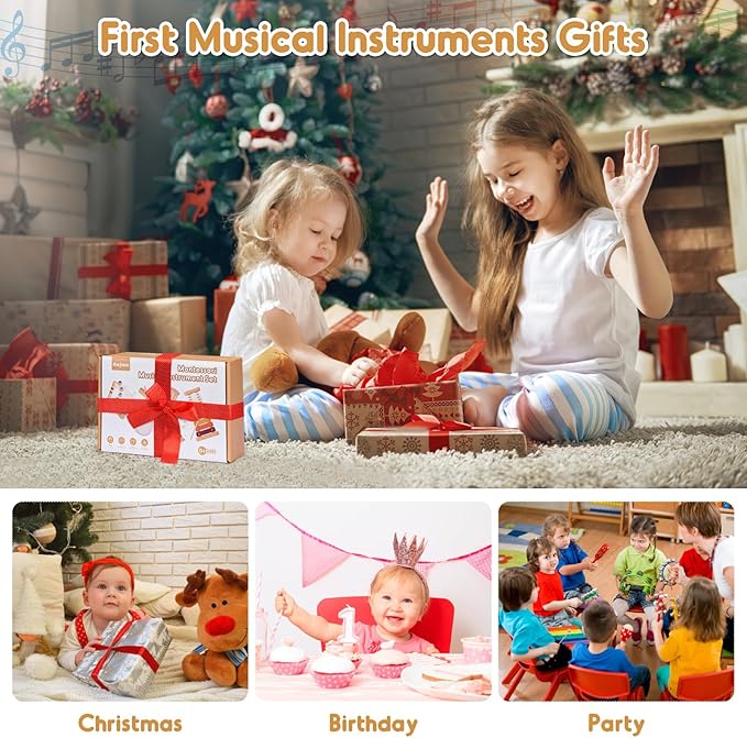 - First Muisc Gift Set for Kids: With beautiful gift-ready gift box and a storage cotton bag, this musical instruments set is the perfect present for baby girls and boys on Children's Day, birthdays, Christmas, and special school class activities, which will provide a rich sensory experience, enhances children's perception of music, exercises the baby's brain power, and promotes all-round development.