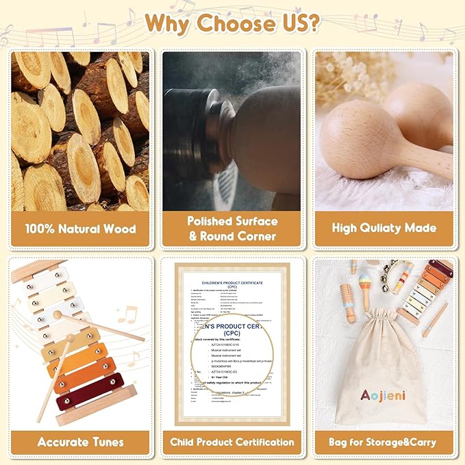 - Safe Wooden Toys for Ages 0+: Each music instrument is crafted from 100% natural wood, with rounded edges and a smooth finish, making them durable and safe for little hands to play with. The color coatings are skin-friendly and non-toxic, which have undergone rigorous professional testing and have been awarded child safety certification (CPC&ASTM), making it safe musical educational toy for children of all ages.