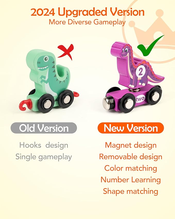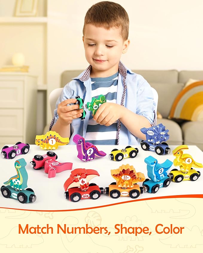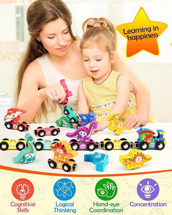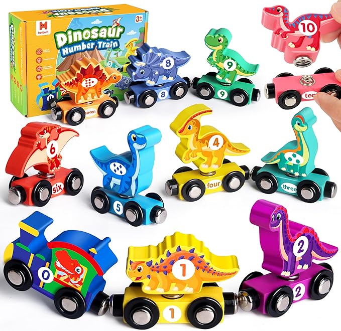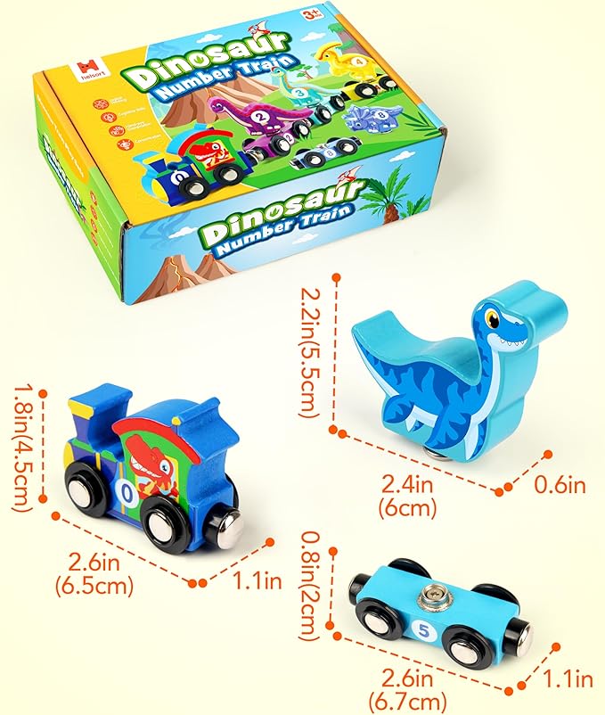 - 1. Upgraded Dinosaur Train Set for Toddlers: Our wooden dinosaur train set for toddlers includes numbers 0-10 on train cars, each paired with matching numbered dinosaur toys. This upgraded version combines dinosaurs and numbers in fun matching games, helping kids aged 3-5 learn numbers, shapes, and colors while boosting imagination, problem-solving, and cognitive skills. It’s the perfect gift for dino-loving boys who enjoy hands-on play