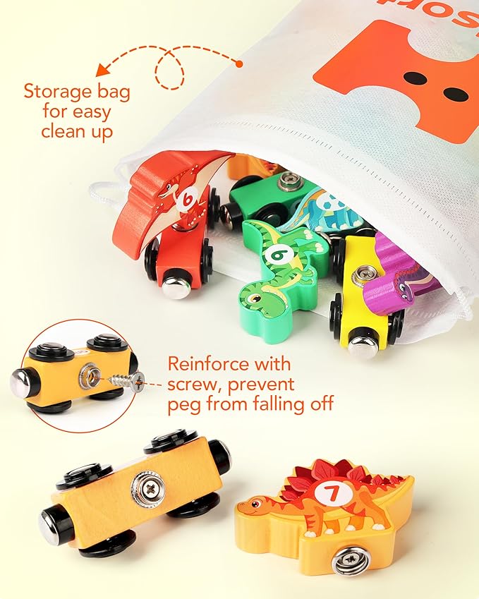 - 3. Educational and Fun Dinosaur Toy Set: Combining the excitement of dinosaurs, colorful trains, and number learning, this wooden train set promotes early childhood development. Kids can explore counting, matching, and problem-solving as they connect train cars and dinosaurs, improving hand-eye coordination and fine motor skills. It’s a perfect Montessori-style toy for toddlers and preschoolers, especially great for sensory play and autistic children