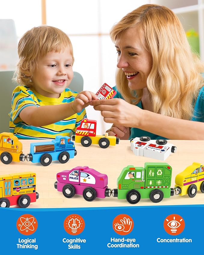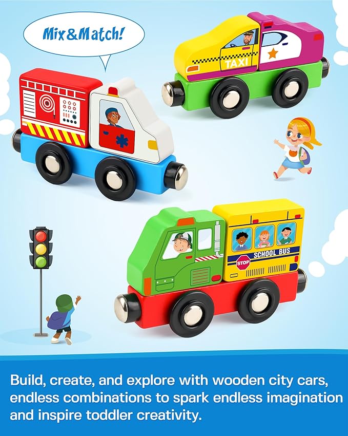 - 1. City-Themed Wooden Train Set: This wooden vehicle set includes 8 iconic city vehicles such as a police car, fire truck, ambulance, and more, all designed to connect like a train. Perfect for sparking imaginative play, kids can build their own city-themed train and create endless stories, ideal for children aged 3 and up
