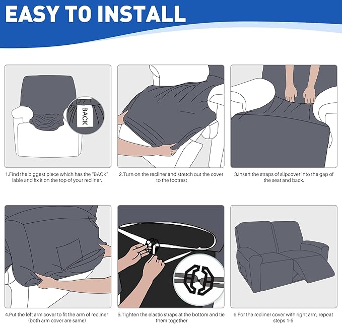 - 【EASY TO INSTALL & CARE】Simply attach the recliner set cover parts to the corresponding parts of the recliner, then tighten and secure the straps, and you'll have a brand new 2 seat recliner couch cover in just 10 minutes!! WASH TIPS: Machine or hand wash in cold water or below 30℃ water. Do not machine wash with the coating facing outwards. Do not bleach or iron. Hang drying is recommended