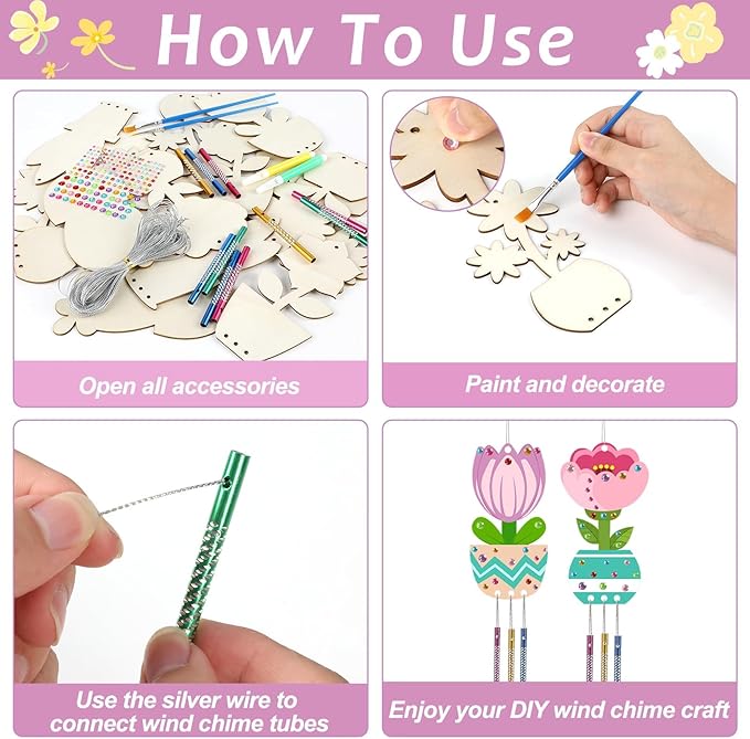 - DIY wind chime kit: Includes 16 pieces of flower unfinished wooden wind chimes(available in 8 styles), 48 pieces of wind chime tubes in 4 colors, silver wire of 65.6ft/20m, 2 sheets of water diamond stickers, 2 paint brushes, a set of 12 color watercolor pens. With ample quantities and diverse styles, it's ideal for children's creative activities, enabling them to craft their own unique flower wind chime.