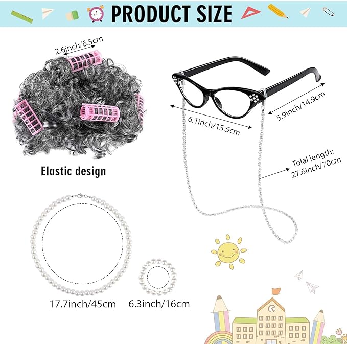 • Package Include: This 100 days of school old lady costume set includes 1 old lady curly wig, 6 pink curlers, 1 100 days of school printed T-shirt, 1 plastic cane, 1 pearl necklace, 1 pearl bracelet, and 1 pair of glasses with a matching glasses chain. It comes with everything pictured, and the quantity is enough for you to complete your outfit.