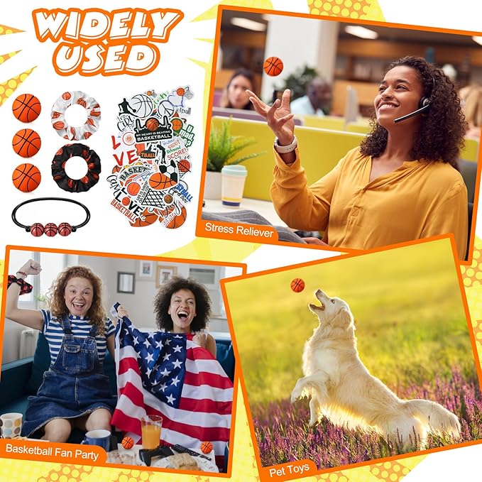 - Widely Applicable: basketball balls can be applied to release stress and ease the tension; Basketball wristband bracelet with cute, simple and adjustable design, accompanied by striking sports basketball bead decoration, can be wear to show team spirit and show others they are a team; Stickers can be applied to decorate your water bottle, tablet PC, laptop, scrapbooks, computers, skateboards, and more, basketball scrunchies can be applied to tie your hair or put on your hand