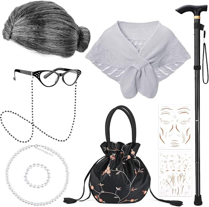 - 【Fabulous Old Lady Accessories】you will receive a piece of old lady wig,a cozy grandma shawl,a pair of old lady glasses,1 piece of glasses chain,1 piece of artificial pearl necklace,1 piece of artificial pearl bracelet,1 embroidered handbag,1*foldable cane and 2 styles of temporary wrinkle tattoos stickers,ideal combination for your old lady dress,you can dress up with your friends, it seem to be the age of grandmothers when you wear these cute granny costume accessories.