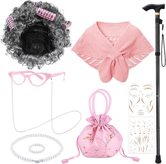 - 【Fabulous Old Lady Accessories】you will receive a piece of old lady wig,a cozy grandma shawl,a pair of old lady glasses,1 piece of glasses chain,1 piece of artificial pearl necklace,1 piece of artificial pearl bracelet,1 embroidered handbag,1*foldable cane and 2 styles of temporary wrinkle tattoos stickers,ideal combination for your old lady dress,you can dress up with your friends, it seem to be the age of grandmothers when you wear these cute granny costume accessories.