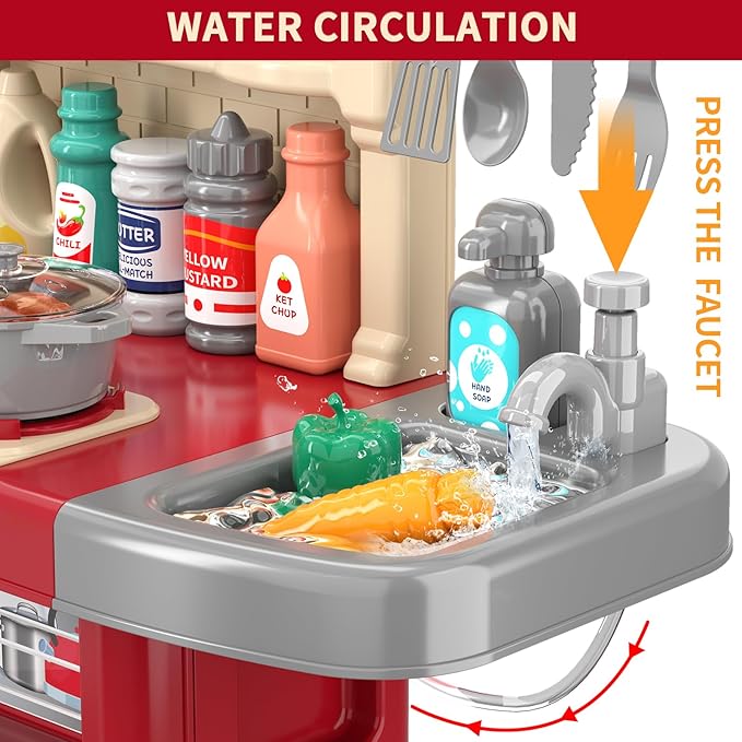 - Cute Sink Toys & Large Storage Space - Kids kitchen playset is designed with water circulation which more environmentally friendly. Kids can wash vegetables, fruits, tableware in the sink. Compared to other toy kitchen sets, our kitchen playset have more storage space. You don't have to worry about clutter and missing accessoriesKids, the kitchen playset all the cabinets can be opened and stored accessories.