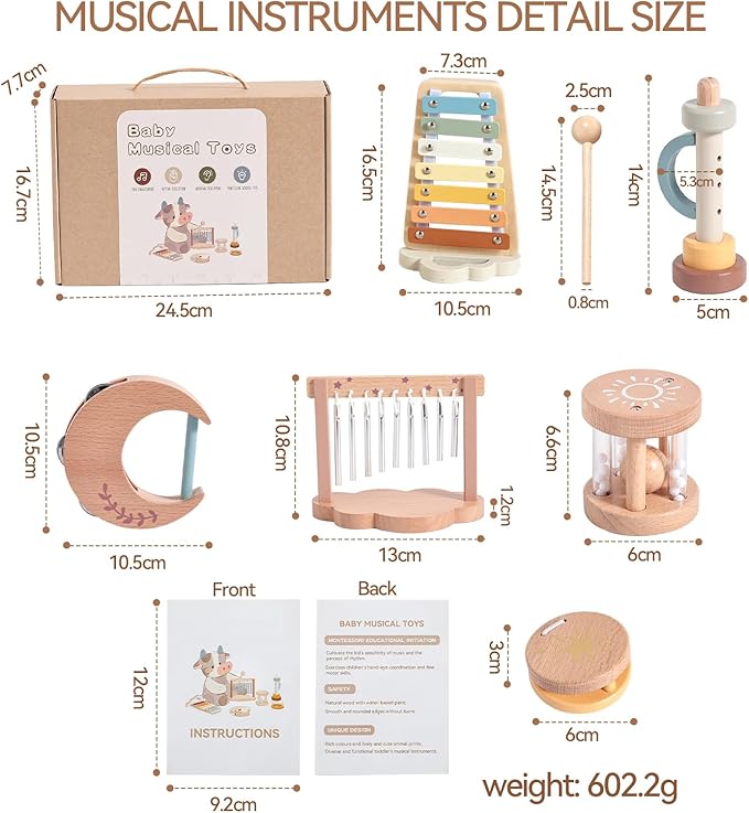 - Safety First with Premium Materials -- Crafted from high-quality, natural wood, our Baby Musical Instruments are designed with smooth surfaces and rounded edges, ensuring safe play for both boys and girls. CPC certified, BPA-free, non-toxic, and easy to clean, these instruments prioritize your child's safety and well-being