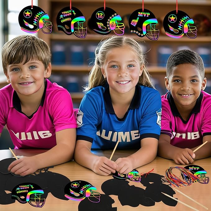 JULMELON 36 PCS Football Crafts for Kids, Rainbow Scratch Paper Art for Kids Football Party Favors Football Helmet Scratch Off Cards for Football Themed Birthday Party Supplies School Activities