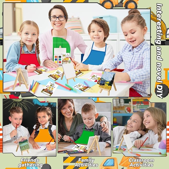 - All-Inclusive Paint Party Supplies: you will get 24 monster truck cards, 24 small canvases, 24 sturdy small easels, 24 watercolor paint sets, 24 multi-colored aprons tailored for children, and 24 gift bags. You can put them in the bags and give them to beginner artists