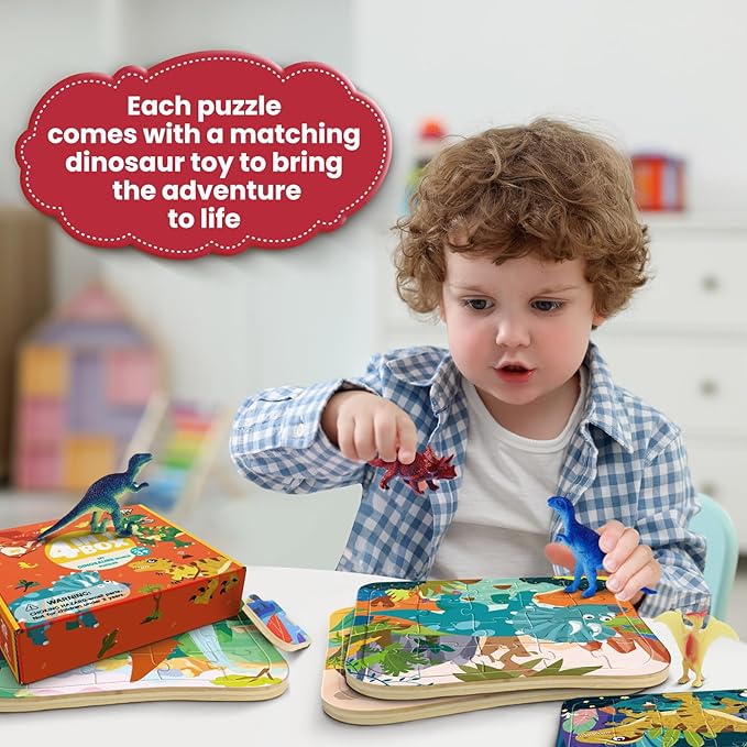 - 1.Engaging Wooden Puzzles for Kids - This set includes 4 realistic small dinosaur figure, 4 vibrant and sturdy wooden jigsaw puzzles, each with 20 pieces that fit together seamlessly. Perfectly packed in a colorful box to keep everything organized.