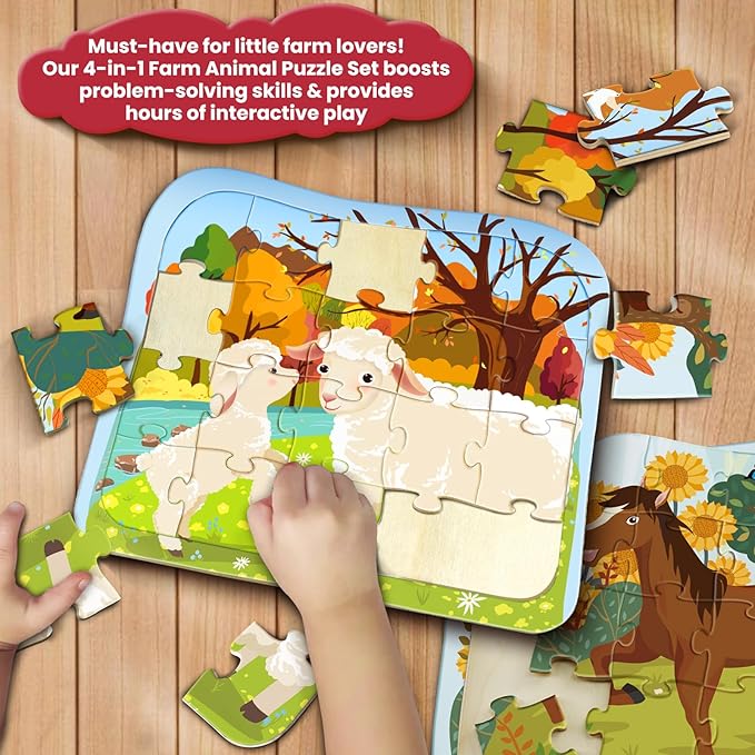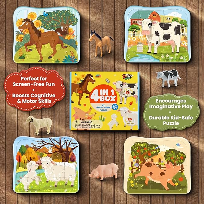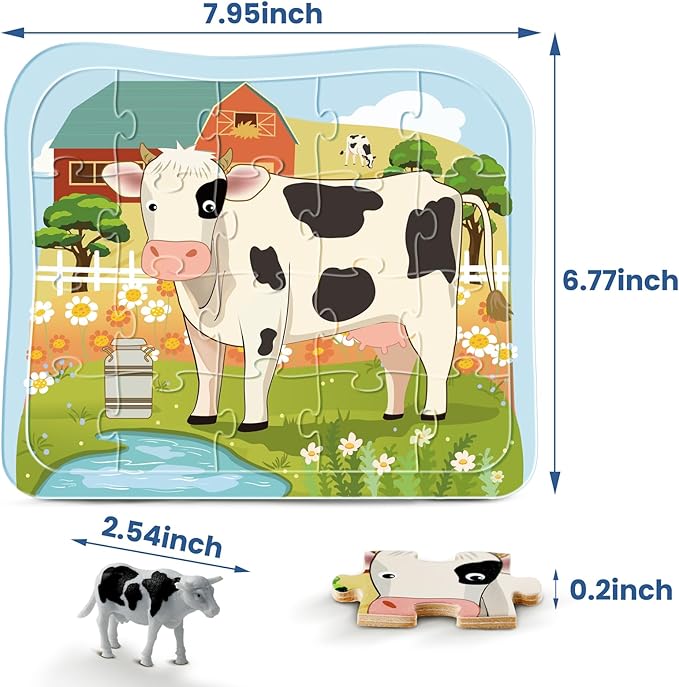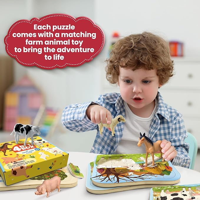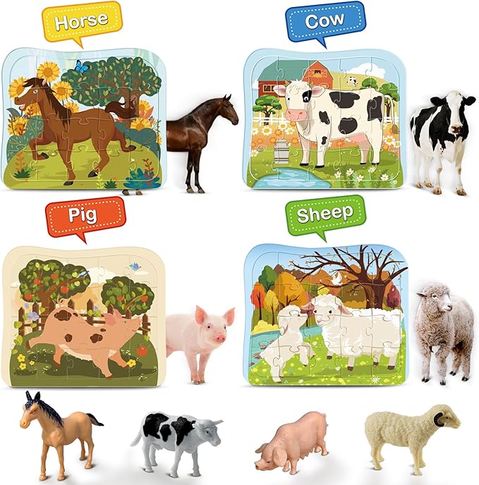 Wooden Farm Animal Puzzles for Kids Ages 4-6, 4 in 1 Gift Box 4-Pack 20-Piece Jigsaw Puzzles Come with 4 Small Animal Figures,Preschool Educational Toys Gifts for Kids Boys Girls Ages 3+