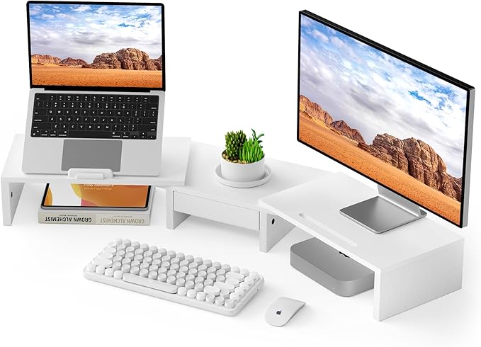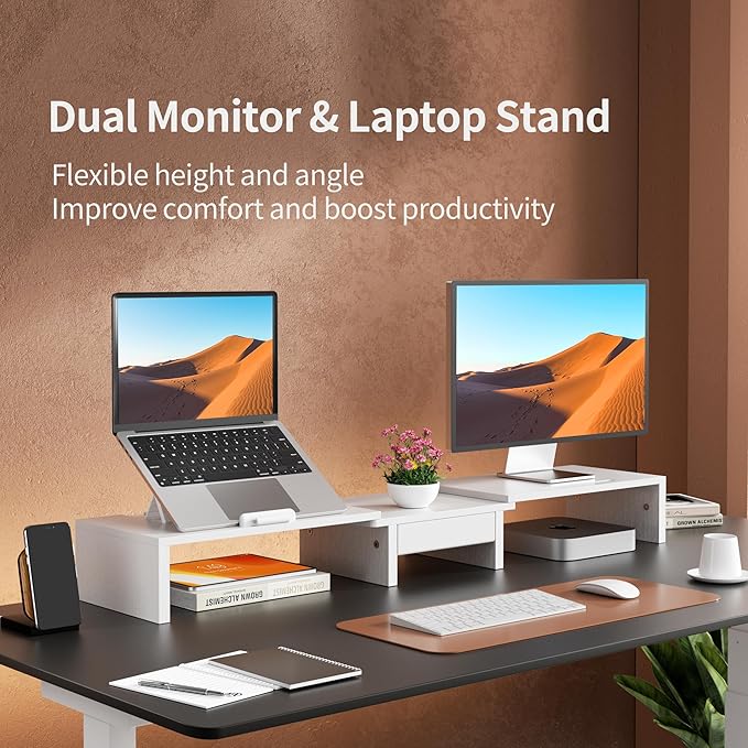 Dual Monitor Stand Riser - Computer Monitor Stand for 2 Monitors,Office Desktop Organizer,Adjustable Length and Angle 3 Shelf with Storage Drawer Phone Holder for Monitors and Laptops-White