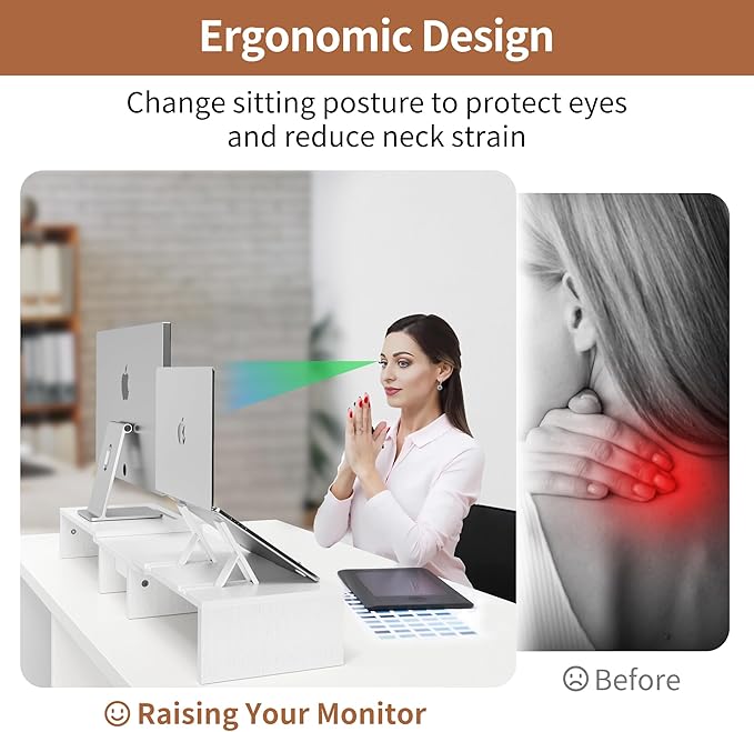 - Efficient Space Utilization: This monitor riser can support two monitors simultaneously while providing additional storage space underneath. Whether it's a computer, gaming console, or office supplies, everything can be neatly organized, eliminating desk clutter and making your workspace more orderly.
