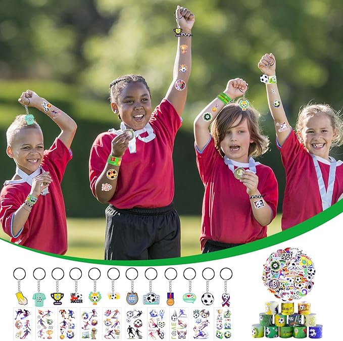 - Soccer Party Favors:132PCS Soccer Party Supplies for Kids Contain 12 Soccer Bags(10.6 x 13.7 inches) 12PCS 2.4 Inch Mini Soccer,12 Soccer Slap Bracelets 12 PCS Keychains 50PCS Stickers 12PCS Bracelet 12PCS Soccer Whistle 10PCS Tattoo stickers.