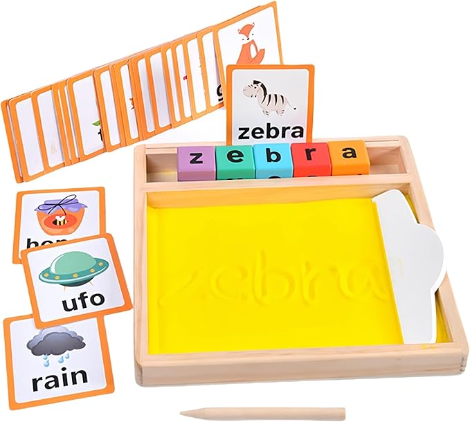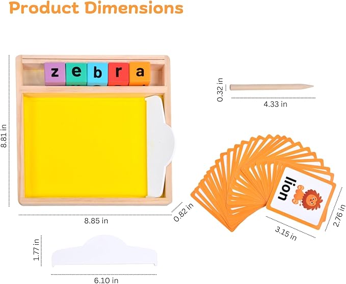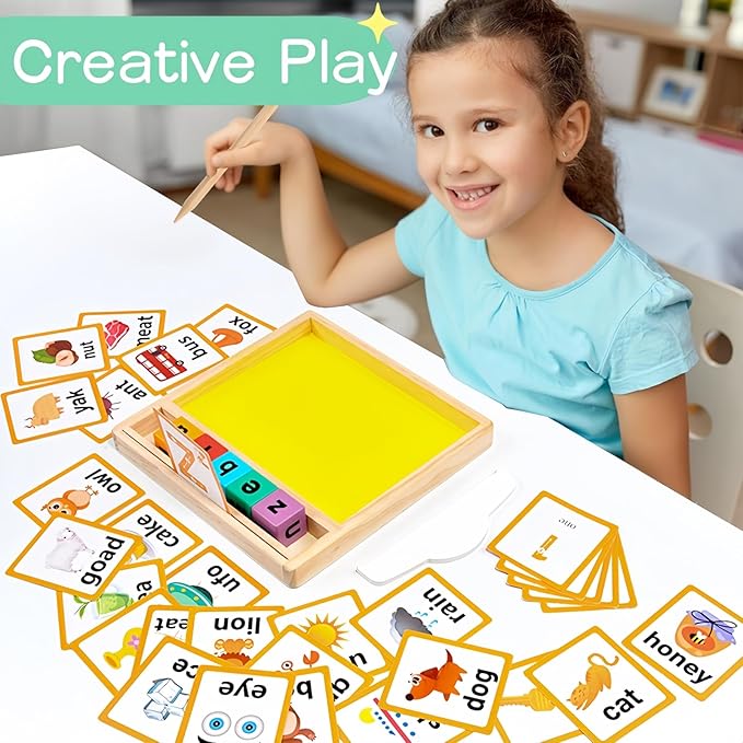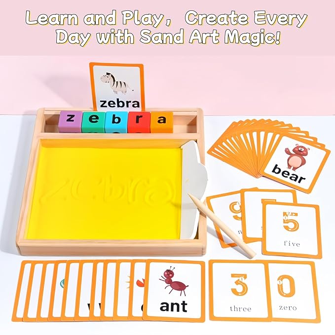 - 👋【 Complete Set for Endless Educational Play】👋 Includes a sturdy wooden sand tray, fine yellow sand, a wooden writing stylus, colorful alphabet blocks, and illustrated word cards. Children can trace, write, and spell words while engaging with playful illustrations.