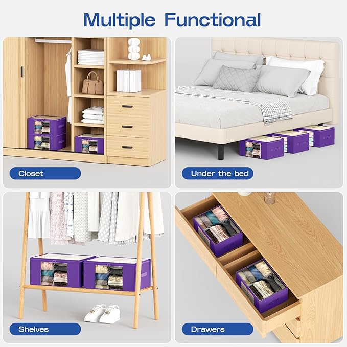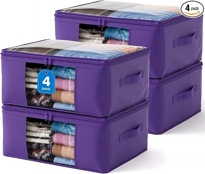 Clothes Storage Bags, Foldable Thick Fabric Blanket Storage Bags, Large Clear Window & Carry Handles, Great for Clothes, Blankets, Closets, Pillows, Toys (Purple, 4PACK)