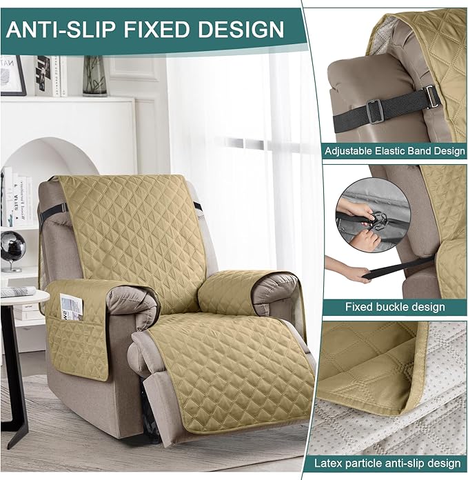 Ruaozz 100% Waterproof Recliner Chair Cover Non-Slip Oversized Reclining Cover for Large Recliner Chair Washable Chair Seat Cover with Elastic Straps for Kids, Dogs, Pets (Sand, 28'')